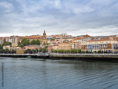 Fototapeta premium Vistas de una torre lejana en la ciudad de Bilbao, con casas al fondo junto al mar, verano 2020