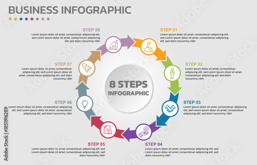 © thailerderden10, Fototapeta premium Visual data presentation. Cycle diagram with 8 options. Pie Chart Circle infographic template with 8 steps, options, parts, segments. Business concept. Editable pie chart with sectors.