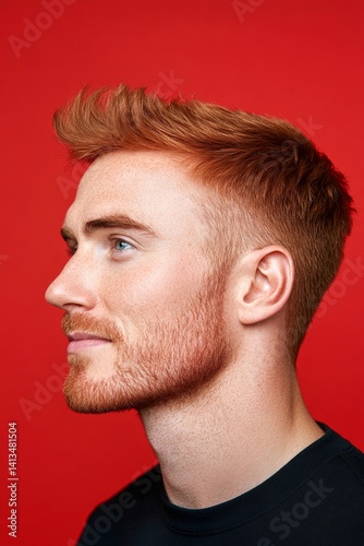 © R, Obraz premium Visual idea of style for aging men. Elegant men's classic short back and sides haircut - midlife white man with red hair. Red solid background. A handsome man with a captivating smile.