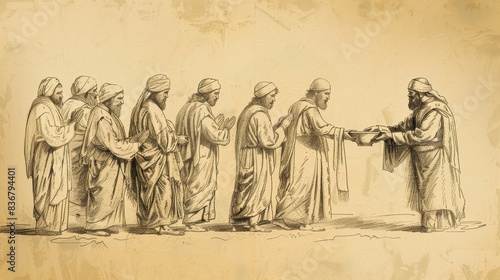 © T Studio, Fototapeta premium Visual of Ten Minas Parable: Servants Entrusted with Money, Beige Background, Biblical Illustration, Copyspace