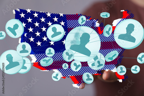 © vegefox.com, Fototapeta premium Visual representation of social media network across the United States. Ideal for articles on social trends, connectivity, and demographics.