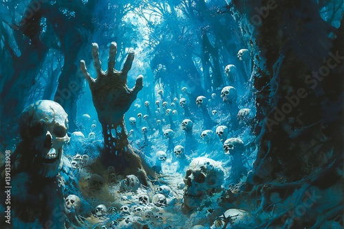 © Quy, Fototapeta premium Visual Showing Hand emerging from ground in eerie blue forest.