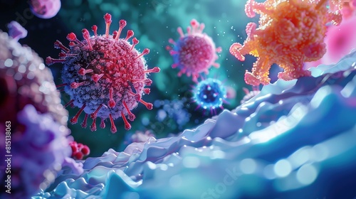 © Gefo, Naklejka premium Visualization of a complex viral assembly process within a host cell in a research lab.
