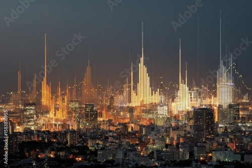 Fototapeta premium Visualization of advanced data analytics in urban cityscape showcasing trends and patterns at twilight