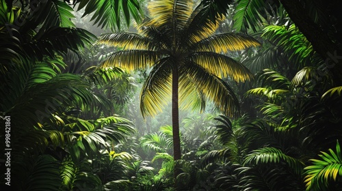 Fototapeta premium Visualize a coconut tree in a tropical rainforest, surrounded by dense...
