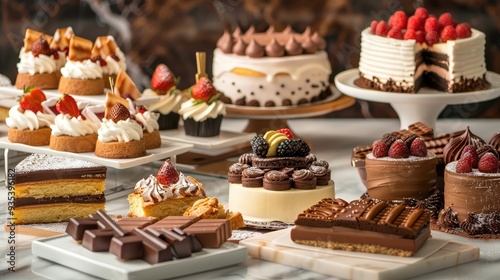 Naklejka premium Visualize a decadent dessert spread featuring an assortment of cakes,...