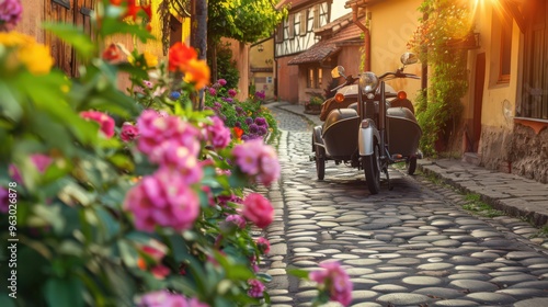 Naklejka premium Visualize a motorcycle with a sidecar driving through a quaint village, with cobblestone streets,