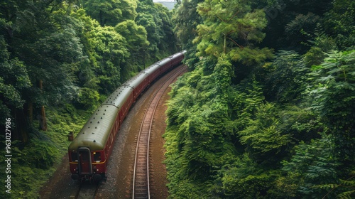 © Thirawat, Fototapeta premium Visualize a passenger train moving through a dense forest, with tall trees and a narrow track winding through the greenery