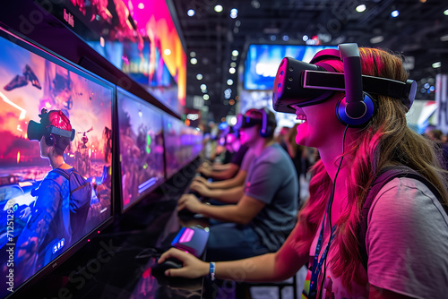 © YouAreBeautiful, Fototapeta premium Visualize a vibrant gaming convention booth showcasing the latest VR technology.