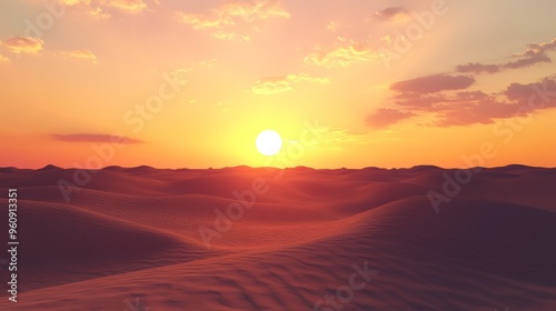 Fototapeta premium Visualize the desert sun setting in the distance, with its last rays casting a warm glow over the textured sand dunes and creating a tranquil, picturesque scene
