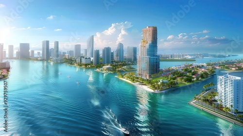 Fototapeta premium Visualize the Miami skyline from a bird's-eye view, capturing the vibrant urban landscape and surrounding waters.