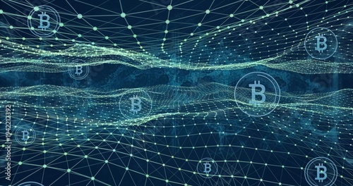 © vectorfusionart, Fototapeta premium Visualizing central 3D blockchain network mesh glowing on dark blue field, with Bitcoin symbols