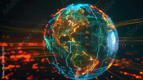 Obraz premium Visualizing Global Data Holographic Globe in High-Tech Environment