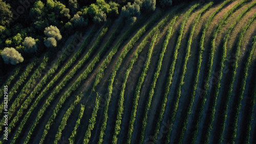 Fototapeta premium Visually striking high-altitude view of a lush green vineyard, revealing...