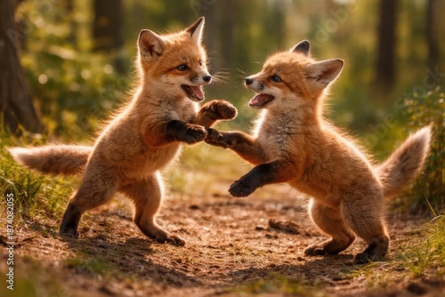 © The 2R Artificiality, Fototapeta premium Vivacious juvenile foxes engaging in playful antics outdoors