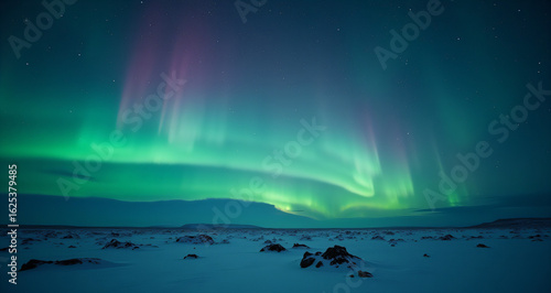 © Volition, Naklejka premium Vivid Aurora Borealis Over Snow-Covered Landscape Under Starry Night Sky
