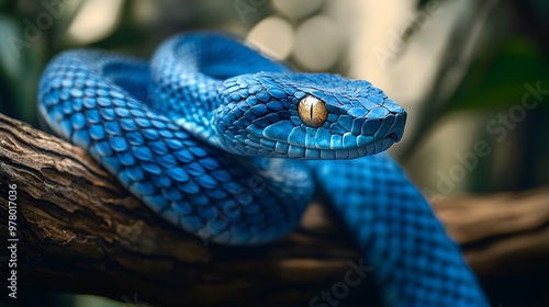 Fototapeta premium Vivid blue pit viper with glowing amber eyes coiled in a dimly lit forest environment showcasing its detailed scales