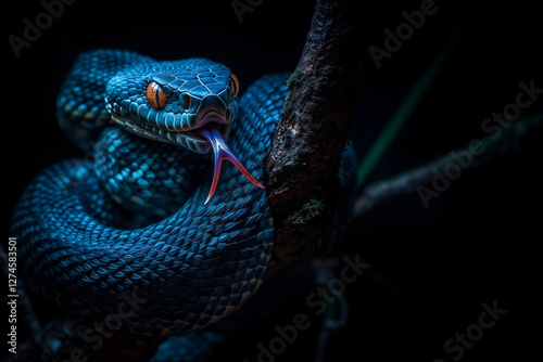 © Rivet Render, Obraz premium Vivid Blue Snake Coiled on a Tree Branch: Full-Body View with Tongue Out, Captured Against a Black Background, Highlighting Its Grace, Striking Color, and Mysterious Elegance in Nature