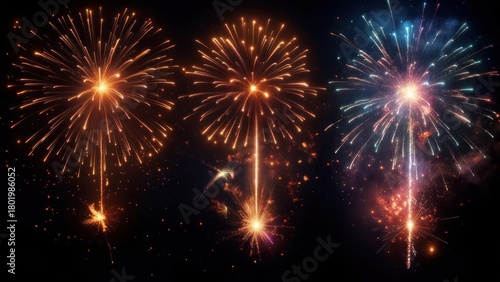 Naklejka premium Vivid bursts of pyrotechnics explode across a dark sky, showcasing vibrant...
