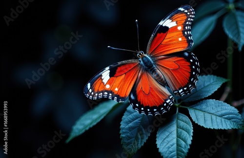 © starush, Fototapeta premium Vivid butterfly with orange and black wings resting on green leaves in natural environment