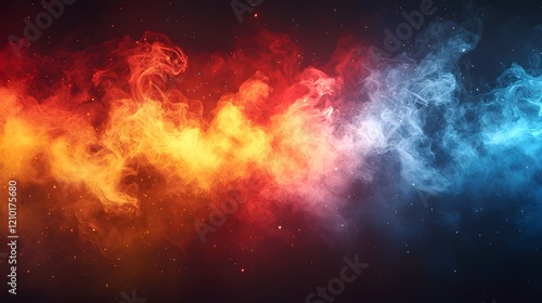 Fototapeta premium Vivid cinematic background featuring dynamic swirls of fiery smoke haze and fog in a captivating blend of red orange yellow and blue tones creating a dramatic and atmospheric visual effect
