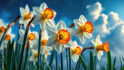 © ArtificialHorizons, Fototapeta premium Vivid close-up of blooming daffodils with orange centers in a vibrant garden scene, showcasing flora and natural beauty under a clear blue sky.