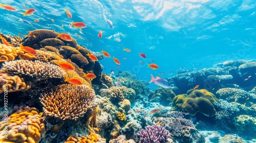 © ThienThu, Naklejka premium vivid color of ocean with clear water and little fishes in the good day