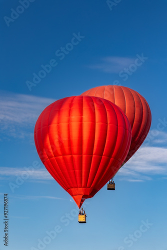 © Igor, Fototapeta premium Vivid colorful hot air balloons close up against clear blue sky on sunny day
