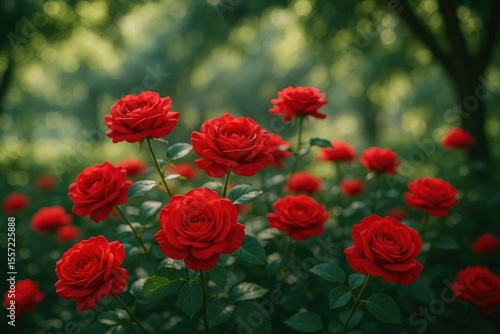 Fototapeta premium Vivid crimson tea roses blooming beneath tree canopies in a morning garden setting