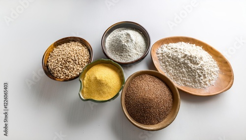 © netsay, Fototapeta premium Vivid Display of Various Grains and Flours A Closer Look at Textures and Colors on a White Background, Showcasing the Beauty and Diversity of Natural Products