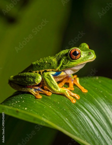 © Ujangbscs, Naklejka premium Vivid emerald amphibian with orange eyes rests on a verdant leaf