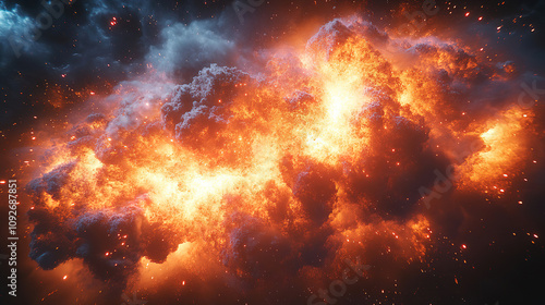 Fototapeta premium Vivid explosion illuminates the sky with fiery hues and dynamic cloud...