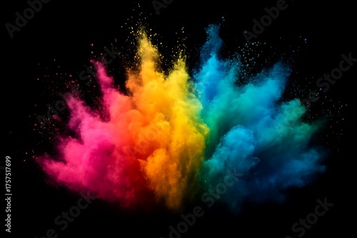 © Tsala, Fototapeta premium Vivid explosion of colorful powder against a stark, black background.