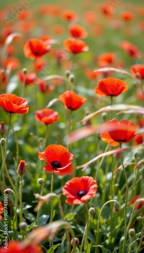 Fototapeta premium Vivid Field Red Poppies Bright Sunlight