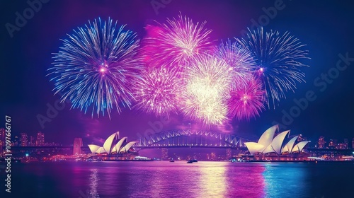 Fototapeta premium Vivid Fireworks Display Over Sydney Harbour Bridge and Opera House