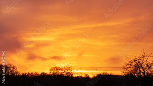 Fototapeta premium Vivid Golden Sunset Sky Over Silhouetted Trees in Peaceful Nature