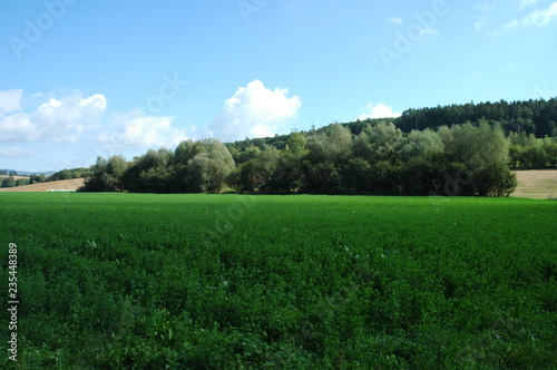 © Lubomr, Fototapeta premium Vivid green field with a forest in the background
