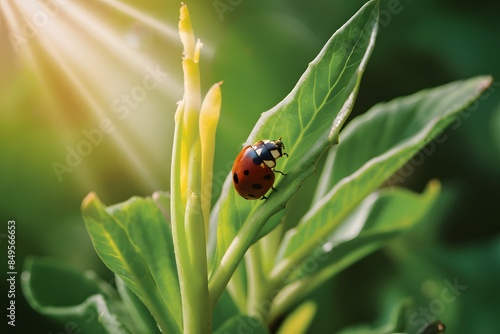 Fototapeta premium Vivid green leaf with red ladybug in sunlight, creating vibrant, natural scene