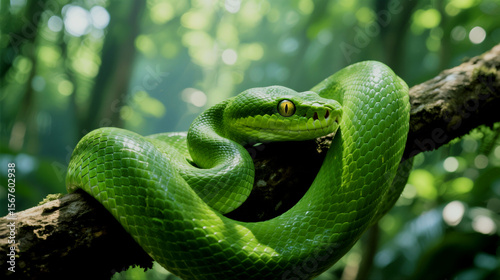 © Abdullah, Obraz premium Vivid green pit viper coils elegantly on a branch amidst lush foliage