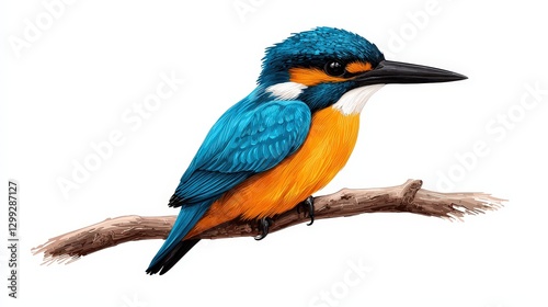 Fototapeta premium Vivid Kingfisher Perched on Branch, White Background