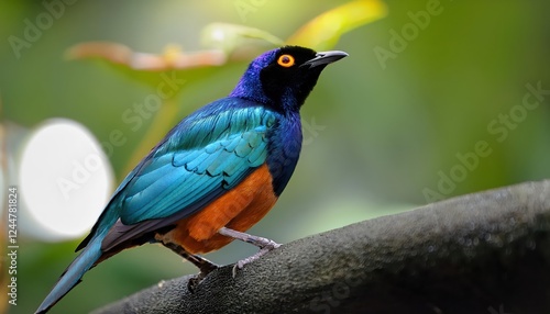 Fototapeta premium Vivid Lamprotornis superbus in Lush Tropical Setting at Jurong Bird Park,...