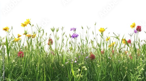© Pannin, Fototapeta premium Vivid meadow flowers growing in lush grass, neatly isolated on a white background with space for your message or seasonal promotions.