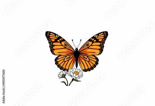 © ILIUSIA, Obraz premium Vivid Monarch Butterfly Illustration Displaying its Orange and Black Wing Patterns while Resting Gracefully on a Delicate White Daisy Flower on a Clear Background