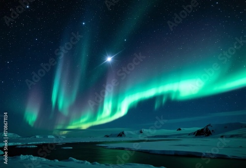 © Julija, Naklejka premium Vivid northern lights dance across the starry sky over the tundra, casting an enchanting glow on the snow covered landscape during the festive holiday season Generative AI