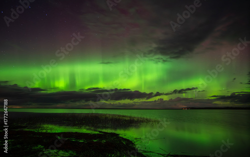 © Aivis, Obraz premium Vivid northern lights glowing green and purple over a calm lake with reflections and scattered clouds under a starry night sky.