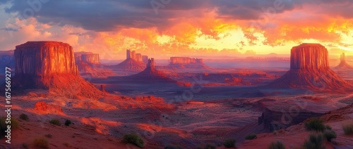 © Aleksandra, Fototapeta premium Vivid orange and purple sunset casting warm light on expansive desert landscape with large rock formations and sparse vegetation