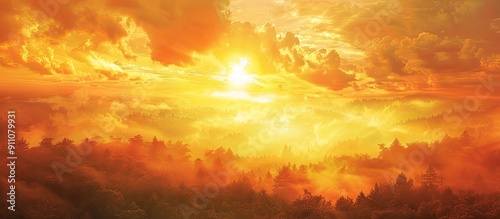 © Ilgun, Obraz premium Vivid orange and yellow sunrise cascades over a sprawling forest as dramatic clouds deepen the scene Ample copy space for image