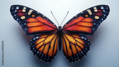 Fototapeta premium Vivid orange butterfly with black stripes on a light grey background.