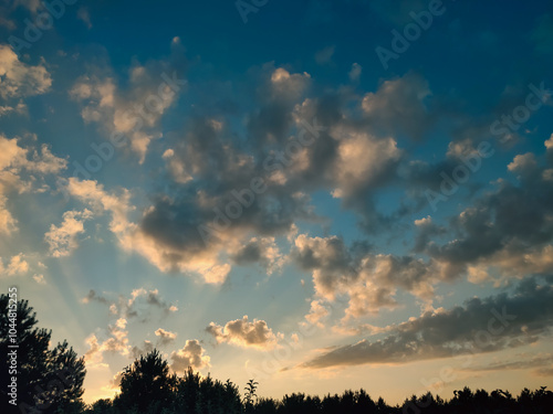 Obraz premium Vivid orange clouds over the forest at sunset. Colorful clouds on the dramatic sunset sky.