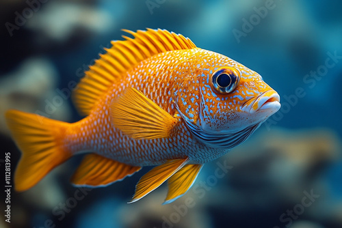 © Johanddss, Naklejka premium Vivid Orange Fish Swims In Blue Water
